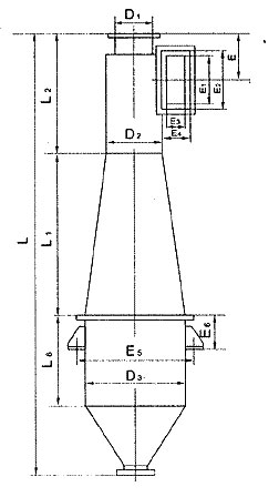 CLK擴散式旋風除塵器,適用于捕集干燥的非纖維性的顆粒狀粉塵,主要特點是筒身呈圓錐形,因而減少了含塵氣體自筒身中心短路到出口去的可能性,并裝有圓錐形的反射屏,防止兩次氣流將已經分離下來的粉塵重新卷起,被上升氣流帶出,因而提高了除塵效率。